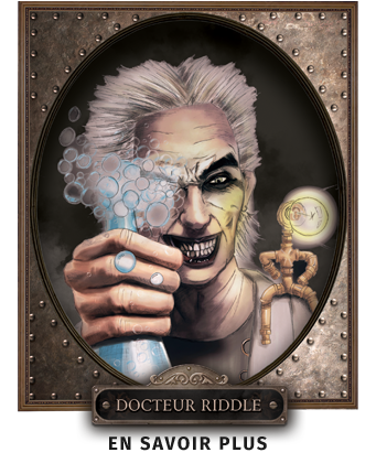 Limogé du cercle de Vedia Lunaris et mis au ban de la société 30 ans plus tôt, le Dr. Riddle se terre sur l’île de Cent-Dragons. Il y mène depuis plus de 5 ans d’étranges expériences scientifiques, donnant vie à des créatures mi-animales mi-humaines dans l’espoir de lever une armée. Il s’est installé là, car il sait que c’est ici que tout commence. Lui aussi a cherché en vain l’Artéfact, mais la chance ne lui a pas encore souri. Qui sait… Cette armée pourrait peut-être lui permettre de retrouver l’Artefact perdu et d’éliminer tous ceux qui se mettraient en travers de sa route. Il est le seul, encore vivant, à savoir que l’Artefact permet d’accéder à un portail sacré, seul chemin vers les entrailles de la terre. Ancien ennemi juré du professeur Dawkins qui l’a fait limoger du cercle de Vedia Lunaris, il est assoiffé de vengeance et de pouvoir. Pour lui, arriver à ses fins lui permettrait de renverser le cours du temps pour conquérir le monde. Il ne reculera devant rien et l’île au Cent Dragons n’a pas de secret pour lui. Les habitants de l’île le voient comme un fou qui vit reclu dans sa sinistre demeure construite sur la falaise nord. Si le Capitaine Barlow réussit à amener ses 2 clientes à bon port, ça ne sera que le début des problèmes pour les Londoniennes.